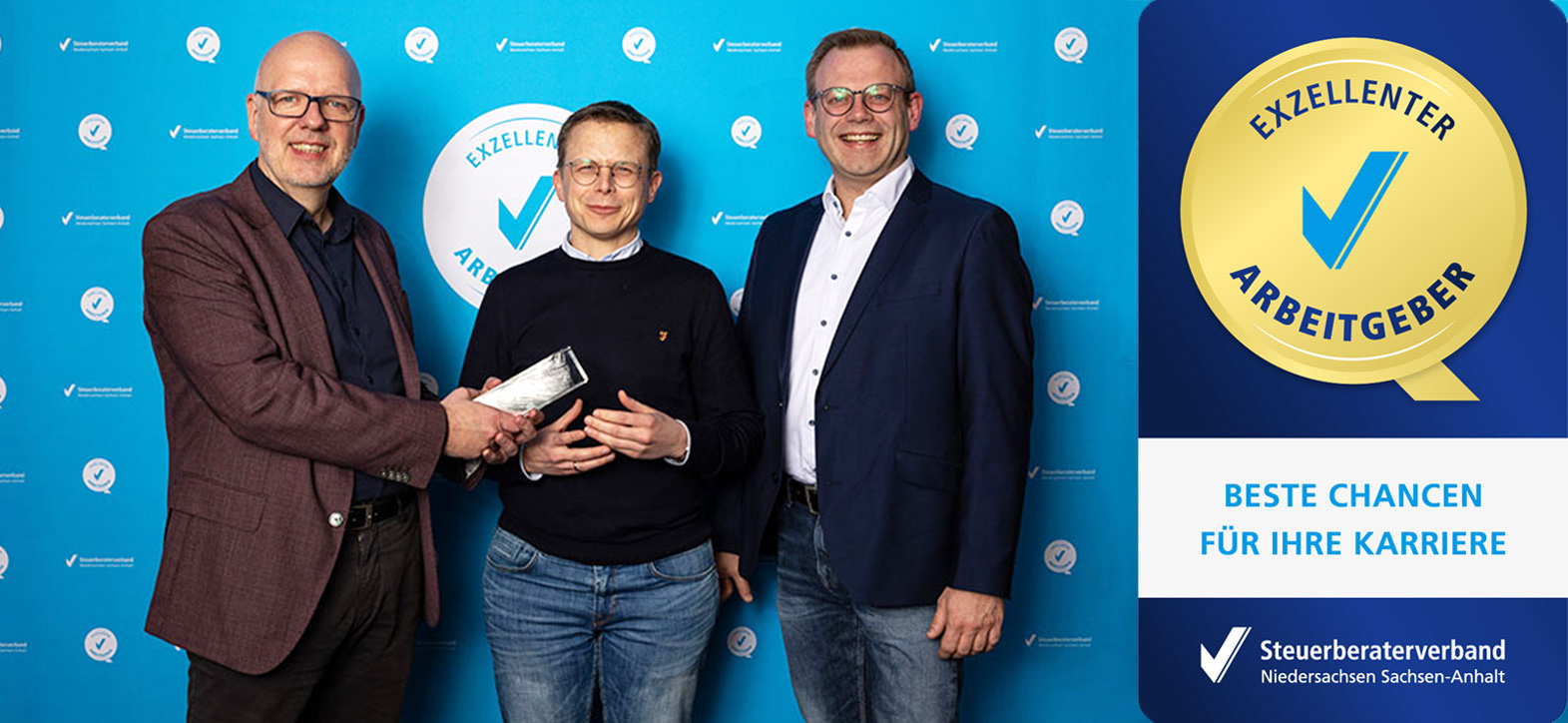 Auch in diesem Jahr hat uns der Steuerberaterverband Niedersachsen Sachsen-Anhalt mit dem Qualitätssiegel „Exzellenter Arbeitgeber“ ausgezeichnet. Die Auszeichnung haben wir u. a. erhalten, durch faire Vergütung, Vereinbarung von Familie mit Beruf, einem kollegialen Arbeitsumfeld sowie flexiblen Arbeitszeitmodellen*.